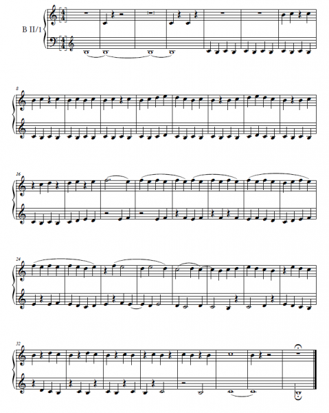 B II/1 (an early version of No. 63: Buzzing) is a kind of trill exercise but acquires a particular colour through the irridescent harmonies in the interval of a ninth. The division of the trill melody in small asymmetric phrases – a further characteristic feature of Bartók – requires hightened rhythmical attention towards the end.